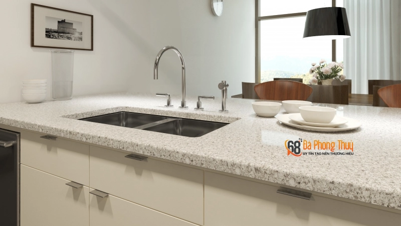 Một ưu điểm khác là khả năng chống thấm nước gần như tuyệt đối. Trong môi trường bếp thường xuyên tiếp xúc với nước, dầu mỡ và gia vị, đặc tính này giúp đá thạch anh duy trì vẻ đẹp lâu dài mà không lo bị ố vàng hay hư hại.