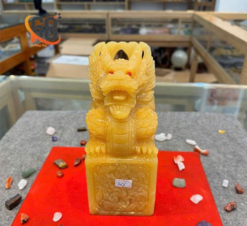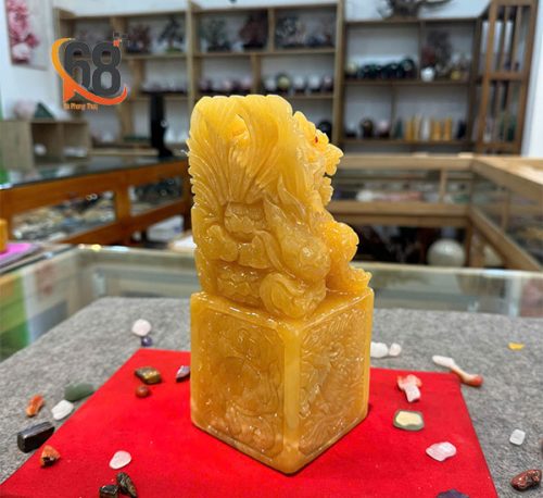 Ấn rồng đá hoàng long là vật phẩm phong thủy được chế tác từ đá hoàng long tự nhiên – loại đá mang màu vàng đặc trưng, tượng trưng cho tài lộc, thịnh vượng và sự cao quý. Phía trên ấn thường được điêu khắc hình rồng uốn lượn – linh vật tối cao trong văn hóa phương Đông, đại diện cho quyền lực, sự thăng tiến và trí tuệ.