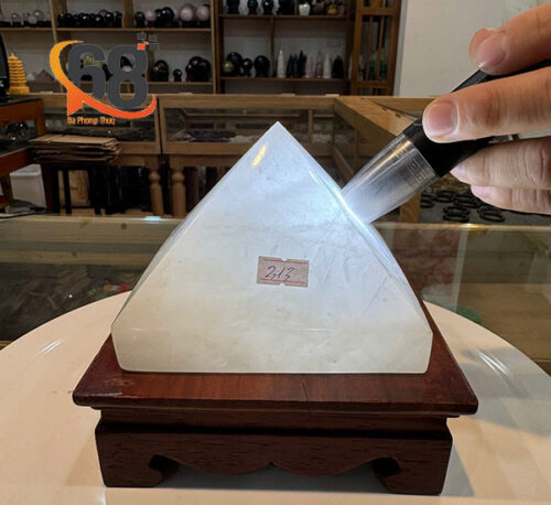 Với khối lượng 2.13kg và thiết kế tinh xảo, kim tự tháp đá thạch anh trắng là vật phẩm phong thủy hoàn hảo. Sản phẩm vừa mang vẻ đẹp trang trí sang trọng, vừa giúp gia chủ thu hút tài lộc và giữ gìn bình an cho tổ ấm.