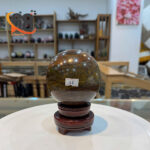 Với trọng lượng 1.7kg, quả cầu này có kích thước ấn tượng, tạo sự hiện diện mạnh mẽ trong không gian. Bề mặt được đánh bóng láng mịn, tôn lên vẻ đẹp sang trọng và bí ẩn của từng vân đá tự nhiên.