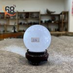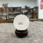 Quả cầu thạch anh trắng 0.68kg trong hình ảnh thể hiện rõ vẻ đẹp hoàn hảo với đường kính khoảng 7-8cm, được gia công tỉ mỉ từ khối thạch anh nguyên khối chất lượng cao. Trọng lượng 0.68kg tạo cảm giác chắc chắn và uy quyền khi cầm trên tay, đồng thời đảm bảo khả năng phát ra năng lượng ổn định trong bán kính 5-8 mét.