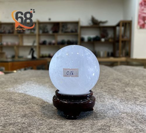 Hình ảnh này cho thấy quả cầu thạch anh trắng 0.68kg trong ánh sáng tự nhiên, thể hiện rõ độ trong suốt và khả năng khúc xạ ánh sáng tuyệt đẹp. Kích thước này được xem là “tiêu chuẩn vàng” cho việc bố trí trong không gian sống, với khả năng phát ra năng lượng ổn định và mạnh mẽ.