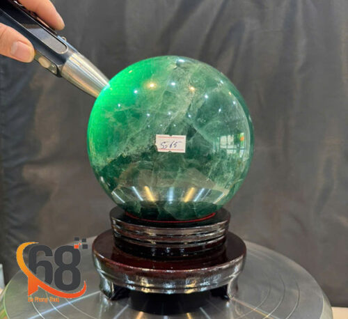 Quả cầu Fluorite xanh 5.65kg được chế tác từ đá Fluorite tự nhiên nguyên khối với sắc xanh ngọc lục bảo trong trẻo quyến rũ. Bề mặt được đánh bóng tinh xảo, tạo độ bóng hoàn hảo, ánh sáng chiếu qua tạo hiệu ứng lung linh đầy mê hoặc. Vân đá tự nhiên độc đáo chạy dọc theo viên cầu, tạo nên vẻ đẹp khó có thể tìm thấy ở viên đá nào khác.