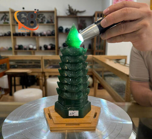 Tháp được gia công từ khối Thạch Anh Xanh nguyên khối, giữ nguyên vẹn năng lượng tự nhiên của đá. Bề mặt bóng mịn, phản chiếu ánh sáng tạo hiệu ứng lung linh, mang vẻ đẹp trang nhã. Hình dáng nhiều tầng xếp chồng tượng trưng cho từng bước thăng tiến trong học vấn và sự nghiệp.